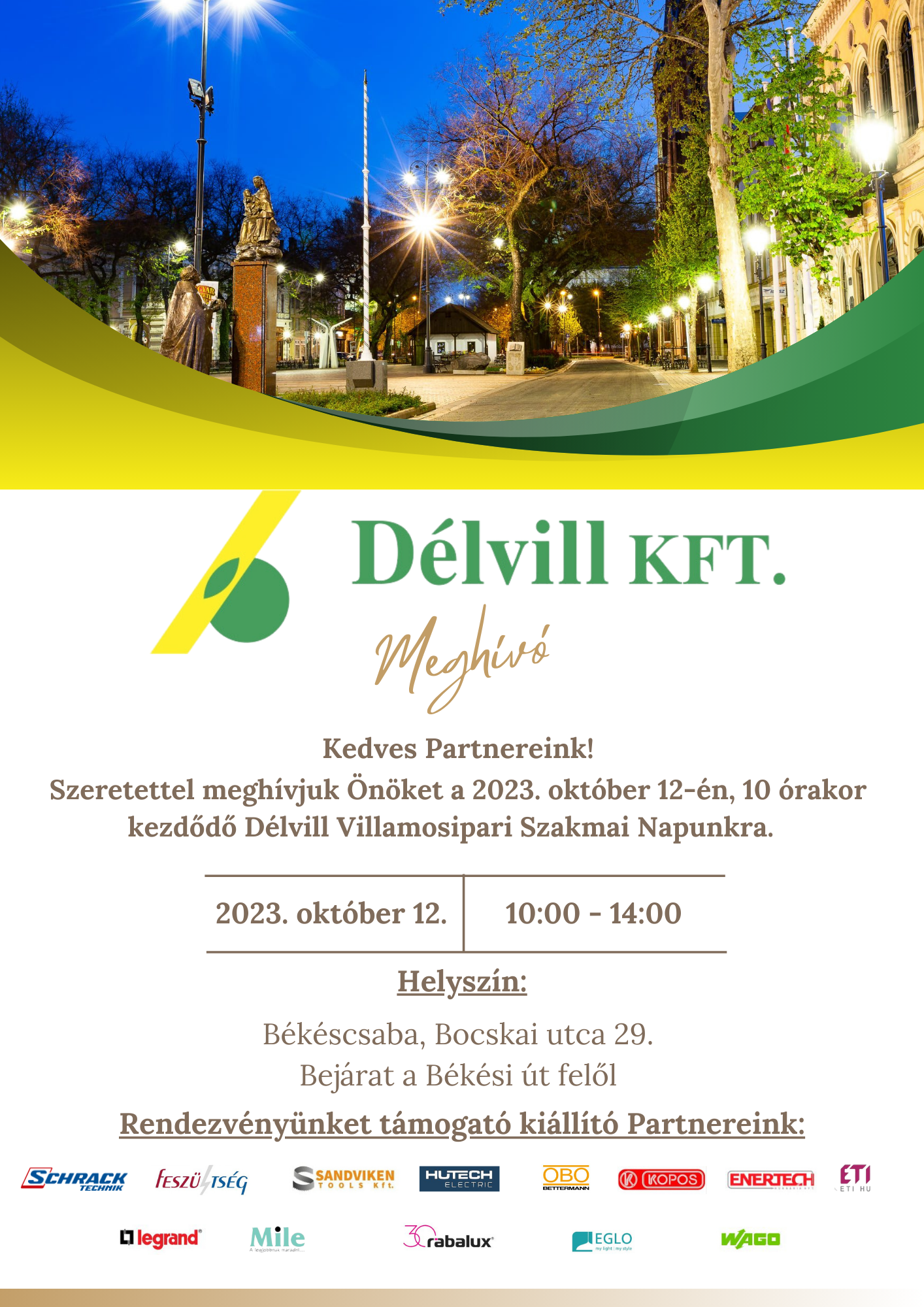 Délvill Villamosipari Szakmai Nap Szeretettel meghívjuk Önt a 2023. október 12-én, csütörtökön 10 órától kezdődő szakmai napunkra! Ismerkedjen meg a villamosipari újdonságokkal és vegyen részt a nyereményjátékunkon is, ahol értékes villamosipari termékeket és szerszámokat nyerhet! Jöjjön el Ön is!